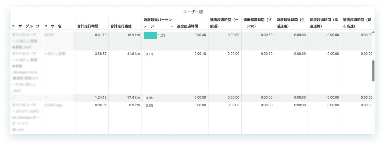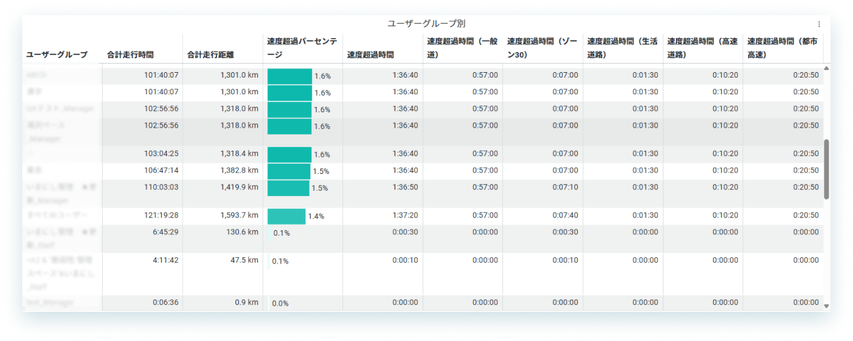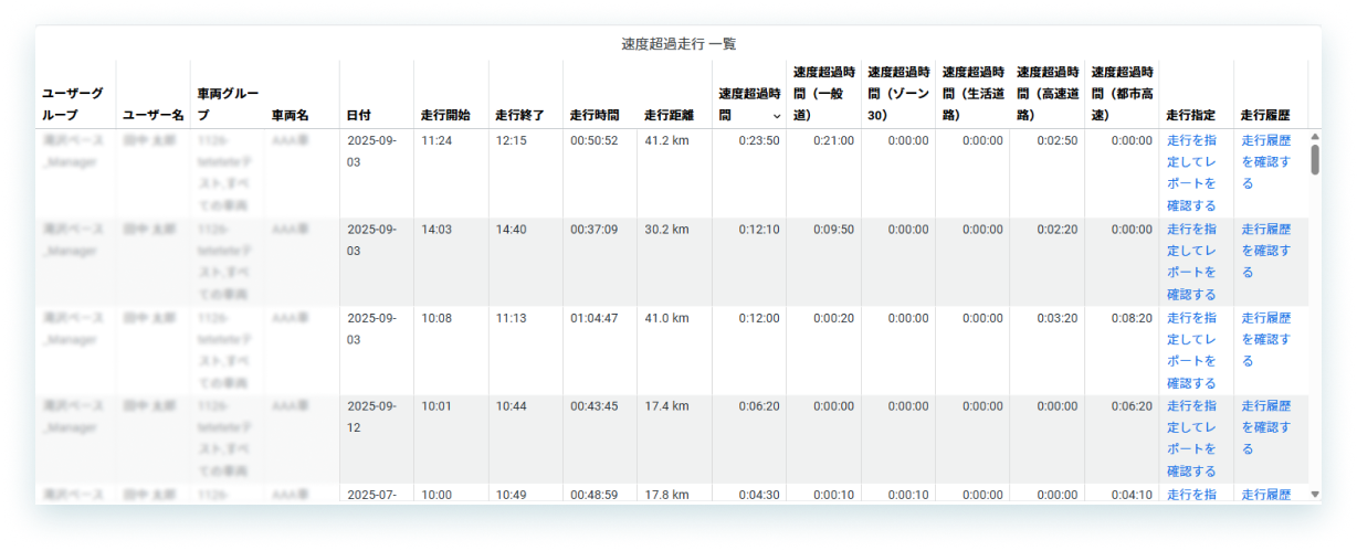 道路ごとの法定・規制速度に対して、実際の走行速度がどの程度超過していたかを可視化します。速度超過の度合いが大きい走行やドライバーを絞り込むことで、安全運転指導や個別のフィードバックに活用いただけます。