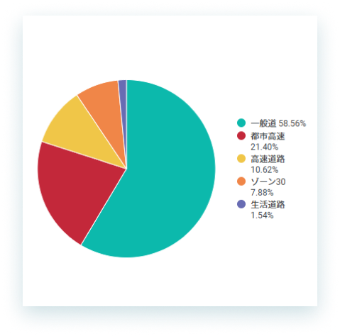 道路カテゴリ別 内訳 全体走行のうち下記のカテゴリが占める割合を円グラフで表示します。