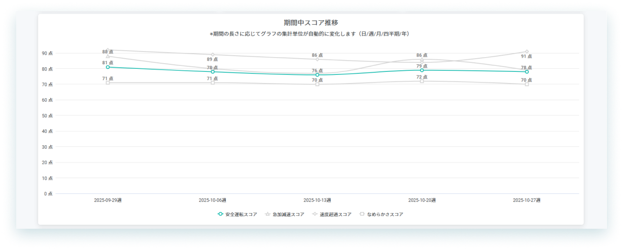 期間中スコア推移 選択しているフィルター条件での安全運転スコア/なめらかさスコア/急加減速スコア/速度超過スコアの4つの指標の推移が表示されます。 |
