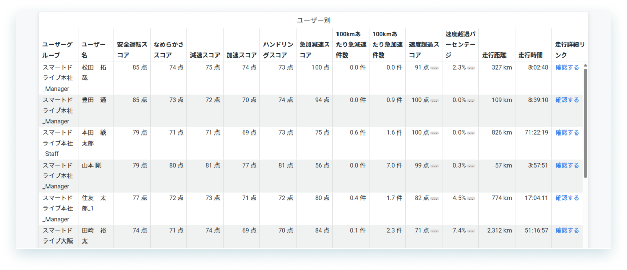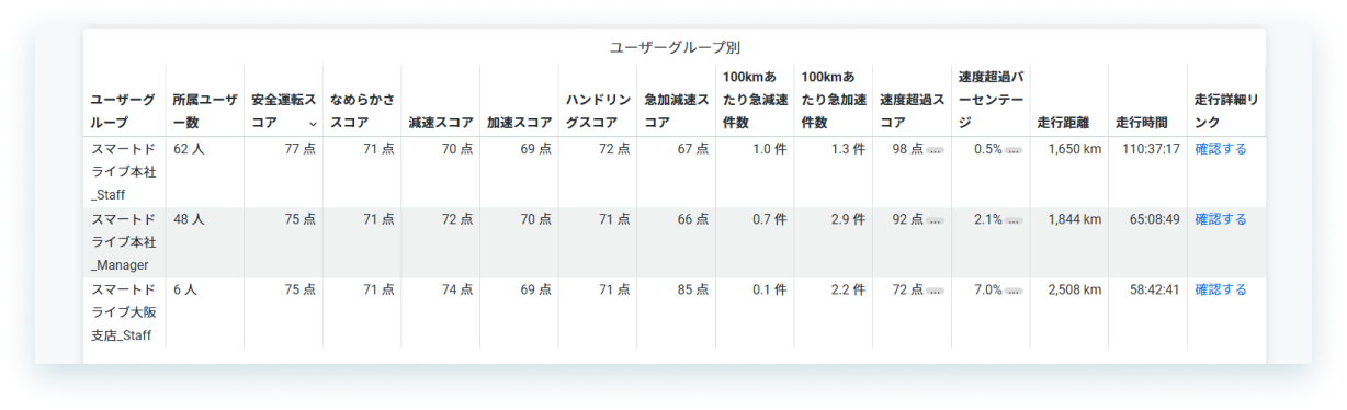 従来の運転スコアに急加減速スコア/速度超過スコアを加え100点満点に再換算した総合的なスコアが確認できるため、安全運転推進の全体的な進捗管理、数値集計にご利用いただけます。